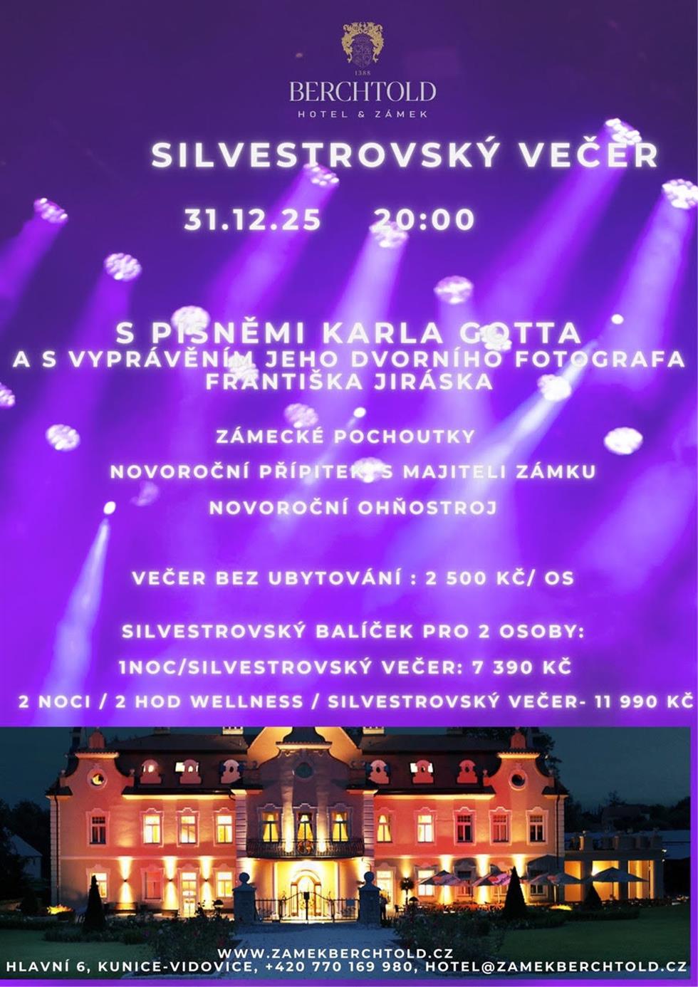 Přijďte oslavit příchod Nového roku s písněmi Karla Gotta, vyprávěním jeho dvorního fotografa Františka Jiráska, křest jeho knihy "Fotografoval jsem hvězdy", rautem a hudbou na vaše přání.